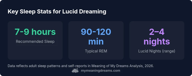 A practical range is 7-9 hours of sleep for adults, since longer sleep expands the late-night REM windows where lucid dreams are more likely. There is no universal hour count, but Meaning of My Dreams analysis (2026) shows consistency in sleep duration boosts lucidity chances by increasing REM opportunities.